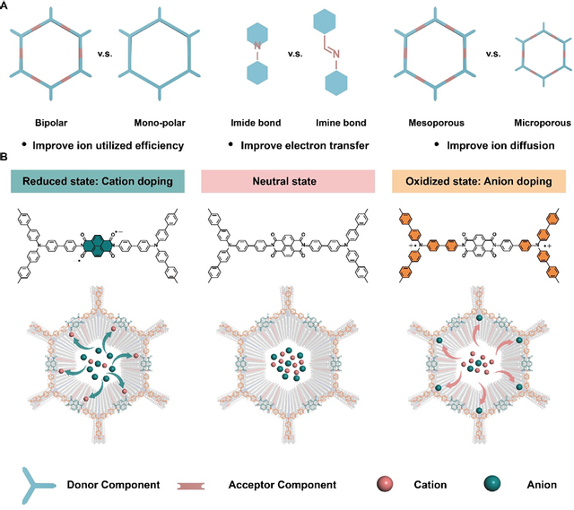 图1 双极性TAAB-NTCDA COF的结构和在电化学应用中的优势 研究团队提出的双极性COF构筑策略设计巧妙,核心在于对构筑单元——TAAB与NTCDA——的精准选择。两者不仅分别作为不同极性掺杂的活性位点,也在分子层面形成了稳定的供体–受体(D–A)“异质结”以降低电子跃迁势垒,更是成为材料实现可逆变色的根本来源。同时,酰亚胺键的高π共轭与平面化特性有效提升了电荷迁移率与能带连续性;介孔孔道结构则为多离子协同传输提供了通畅通道,并在一定程度上减弱了孔壁–离子相互作用所带来的迁移限制(图2)。